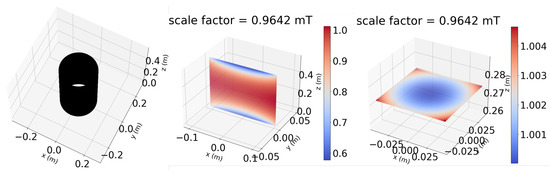 Geometry of the solenoid (left), magnetic field on the xz plane (center) and magnetic field on the xy plane (right).