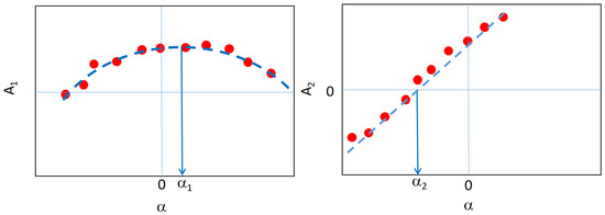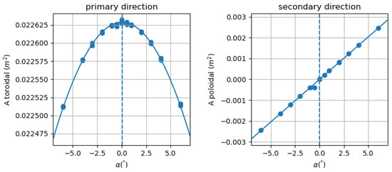 Toroidal (primary, left) and poloidal (secondary, right) effective area values as a function of the angle of rotation for the 3AX sensor; the angle of misalignment is represented by the vertical dashed line.