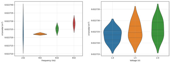 Violinplot for the effective area measurements of the 3AX toroidal winding as function of frequency (voltage variability) and voltage (frequency variability).