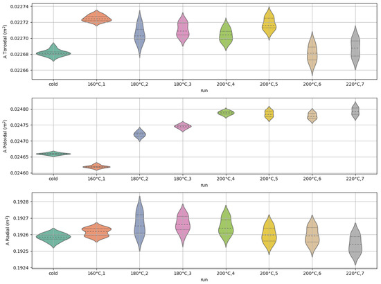 Effective area of each winding for the 3AXE prototype as a function of thermal cycles; the violin plot is obtained on different measurements performed in frequency and voltage.