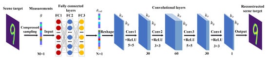 The training process makes use of two learning methods of forwarding propagation and backpropagation to optimize the weights. The initial reconstruction result of the target in forward propagation is used as input and then output to each convolutional layer. In forward propagation, the output of the lth layer is: , where represents the activation function. All layers use as the activation function, where the activation function can be expressed as: