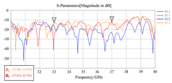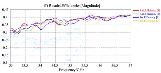 The system parameters of the antenna are shown in Table 1, and the imaging experiment is based on the simulated metasurface antenna radiation field pattern data and the imaging scene. The operation bandwidth of the antenna is 33∼37 GHz, the frequency sampling interval is 10 MHz, and the pattern pattern of each frequency point is sampled along the two-dimensional spherical coordinate system of elevation and azimuth. The field of view (FOV) size is elevation (−60∼60°), and the sampling interval is 2; the azimuth sampling line of sight is (−60∼60°), and the sampling interval is 2, so the dimension of the original pattern is 400 × (61 × 61). In the scheme of feeding by waveguide slot coupling, the return loss and radiation efficiency are shown in Figure 2 and Figure 3.