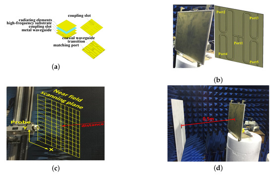 (a) Waveguide slot feeding mechanism; (b) antenna prototype; (c) radiation fields scanning plane.; (d) measurement matrix characterization.