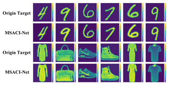 Our MSACI-Net algorithm based on the CNN framework is trained on the ordinary sparse dataset MSACI-MNIST and the extended target dataset MSACI-FMNIST. After completing the training, we conduct numerical experiments and performance evaluation to evaluate the performance of our algorithm. To assess the effectiveness of the algorithm, we implement an experiment with different scene targets when the number of measurement modes is 400. The scene images come from the test sets of MSACI-MNIST and MSACI-FMNIST datasets. We select 12 target images from the two 2 sets to conduct the experiments. The original sparsity of these 12 targets are 0.6312, 0.5954, 0.6721, 0.6856, 0.6423, 0.6229, 0.5117, 0.4996, 0.6463, 0.4786, 0.5116, and 0.4523, respectively. It should be emphasized that noise-free scenes are considered throughout the imaging simulation process to focus on the implementation of the proposed algorithm, and the test results are shown in Figure 5. The experimental results show that our MSACI-Net can not only reconstruct ordinary sparse targets, but also reconstruct extended targets under the conditions of a fixed number of measurement modes and scene compression ratio. Moreover, reconstructed images also can be obtained with high quality by the proposed algorithm.