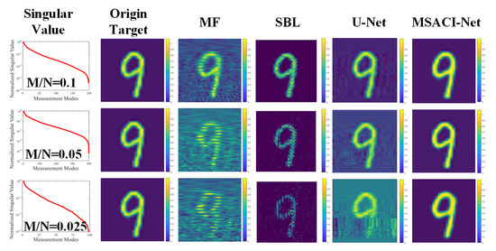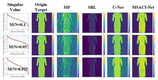 The experimental results show that our MSACI-Net can reconstruct the target image clearly when the scene information sampling ratio is 0.1. Our algorithm can effectively reconstruct the basic shape of the scene target with the decrease in the scene information sampling ratio, even the sampling ratio of 0.025. In contrast, the MF and the SBL algorithm can no longer work normally when the scene information sampling ratio is 0.1. The reconstructed target image is not acceptable, and the original shape cannot be distinguished. In Figure 6 and Figure 7, although the U-Net reconstruction imaging results showed the approximate shape, they could not capture the detailed features specific to the target. Moreover, the original target contour features cannot be precisely reconstructed in the SBL algorithm imaging results; the SBL algorithm is unable to operate in the case of extremely low compression ratios, and the imaging outcomes essentially show no details of the original target. Overall, the performance of the proposed algorithm is more robust and effective than traditional algorithms in low scene compression ratio and high coherence measurement mode. The quality of the reconstructed target image is also high and can face the challenges of imaging algorithm performance in complex scene conditions.