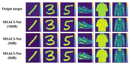 Compared with the generally applied MF method, our MSACI-Net algorithm shows preferable imaging capability under no-noise conditions, given that the end-to-end neural network can adaptively adjust imaging error. In order to further test the anti-noise and robustness of the proposed algorithm, we add additive noise when generating the dataset. Thus, the scene information sampling ratio in the MSACI-MNIST and MSACI-FMNIST datasets are set to 0.1. To study the impact of noise and noise on network performance, we divide our dataset into three noise-free cases, namely, SNR = 0 dB, SNR = 5 dB, and SNR = 10 dB after 100 rounds of testing. Qualitative and quantitative tests are conducted on these two datasets. The imaging reconstruction results are shown in Figure 10. The results show that our MSACI-Net algorithm can not only reconstruct ordinary sparse targets, but also reconstruct extended targets under the conditions of a different SNR and fixed scene compression ratio. Moreover, the proposed algorithm can also obtain reconstructed images with high quality and has relatively excellent anti-noise performance and good robustness when the scene information sampling ratio is 0.1.