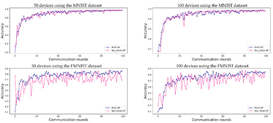 The predictive accuracy of the proposed method is compared with that of a method in which each AP learns individually, without sharing a global model in a decentralized FL system. Figure 4 shows a performance comparison using the MNIST dataset and FMNIST dataset, where (5 APs) and (50 devices) or (100 devices).