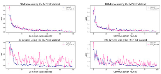 Evaluation of loss of prediction for FL using the MNIST and FMNIST datasets in environments with five APs, for 100 communication rounds. Both the proposed ‘Multi-AP’ and ‘Non_Multi-AP’ models converge when using the MNIST datasets, while the ‘Non_Multi-AP’ model does not converge when the FMNIST dataset is used.
