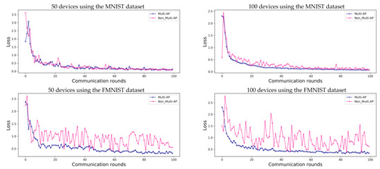 As in the case of general FL, the prediction accuracy values obtained using the proposed method converge. As shown in Figure 5, for the MNIST dataset, both the proposed method and comparative model show convergence. However, when the FMNIST dataset is used, the comparative model’s loss does not converge. Even if the accuracy of the model is as high as that shown in Figure 4, these results should be verified to check the predictive loss shown in Figure 5. Each independent AP has a random device and label, and, therefore, the comparative model is highly accurate, although it is more likely to make incorrect predictions. This implies that each AP has a non-uniform data distribution, as shown in Figure 5. These results also show that the loss graph for FL converges using the proposed multi-AP coordination method. It is confirmed that each independent AP generalizes to a non-IID situation through data sharing.
