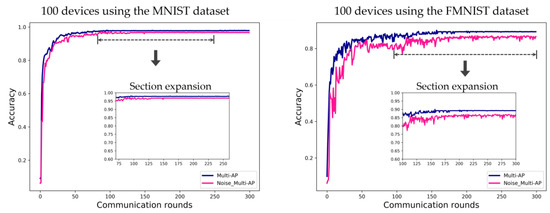 Evaluation of FL accuracy convergence using the MNIST and FMNIST datasets in environments with ten APs, for 100 communication rounds. Label ‘Multi-AP’ is the system with a good channel environment as proposed method, and label ‘Noise_Multi-AP’ means a system with a poor channel environment as the comparison.