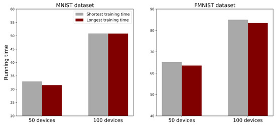 Average running time for FL using the MNIST and FMNIST datasets in environments with 50 and 100 devices in ten APs, for 100 communication rounds. The label ‘Longest training time’, as the proposed method, shows the system in which the AP with the longest training time is determined as the P-AP. The label ‘Shortest training time’, as the comparison, shows the system in which the AP with the shortest training time is determined as the P-AP.