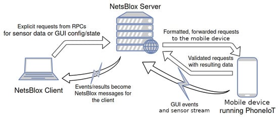 Figure 1. A visualization of backend network interactions between a NetsBlox client, the NetsBlox server, and a device running PhoneIoT.