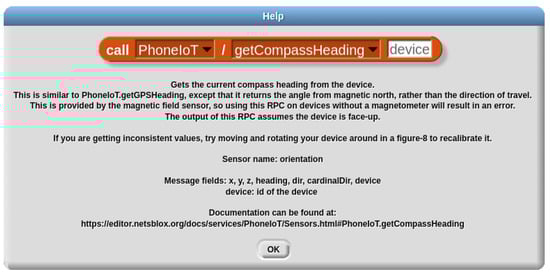 From examining Figure 3, one detail that may not be clear is how to know the name of the sensor to listen to, in this case “accelerometer”. For the most part, the names of the various sensors are identical to their polling RPCs; for instance, the “getLinearAcceleration” RPC has a matching sensor name of “linearAcceleration”. However, this is not always the case, in particular for soft sensors that PhoneIoT adds on top of the existing hardware sensors; for example, the “getCompassHeading” RPC’s sensor is in fact “orientation” (matching the “getOrientation” RPC). This information is available to users through the RPC help menu, which can be accessed by right clicking on a “call” block configured to, e.g., a polling RPC and selecting “help”. Figure 4 shows the help information for the “getCompassHeading” (polling) RPC, which displays the name of the sensor/message type for the streaming access method, as well as the available fields that can be received on each update.