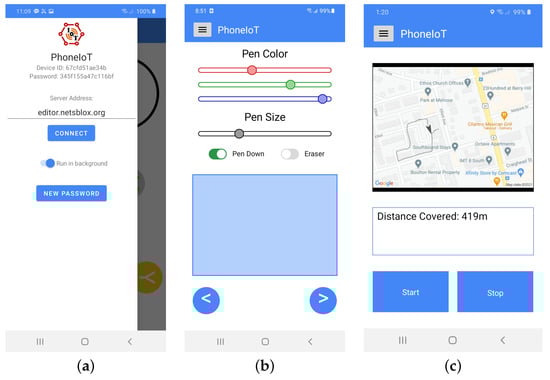 Figure 5. The PhoneIoT app menu (a) and two PhoneIoT apps with various controls (b,c).