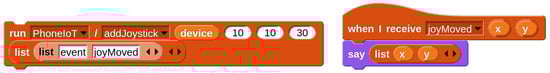 Being able to display custom content on the device is all well and good, but many of these types of controls are intended to facilitate receiving input from the user, such as button presses and joystick movement. To facilitate this, the various RPCs that are used to add controls to the device accept an optional configuration setting called “event”, which is the name of a message type that the device will send when a user interacts with the control. For instance, button events are triggered when pressed, text fields are triggered when the text is modified and submitted (i.e., there is not a separate update for each keystroke), image displays are triggered when a new image is saved in them from the camera (which can only be done manually by the user—see Section 3.1), and joysticks/touchpads send an event when initially touched, continuously while moving (currently throttled to 10 Hz), and when released. Figure 6 gives an example of creating a joystick control with an event called “joyMoved” that is triggered each time the stick is moved and displays the x/y position of the stick on the NetsBlox stage.