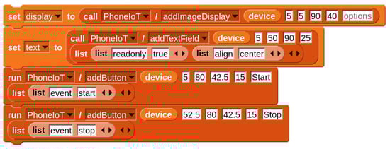 There are several existing approaches that allow for the creation of standalone mobile apps that can be constructed online with a block-based programming interface, including Thunkable, App Inventor, and Kodular (formerly known as AppyBuilder) [7,8,9]. Pocket Code, part of the Catrobat project, is similar to these, although its app designer is built into the app itself and is more focused on creating games and simulations [10]. Thunkable is perhaps the most similar to PhoneIoT, as it allows access to Internet resources (e.g., cloud-based speech recognition and translation utilities) similar to NetsBlox services, as well as several onboard device sensors, such as the accelerometer and gyroscope.