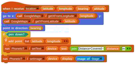 The NetsBlox platform already supports many online services, one of which is Google Maps. With this service, a program can obtain and display a map of the current location, specified by latitude and longitude, or obtain the screen position of a latitude and longitude point on the map and vice versa. By reading live GPS data from a mobile device running PhoneIoT, it is possible to track the location of the device on a map and use NetsBlox’s built-in drawing utilities (inherited from Snap!) to plot the course. Thus far, this has all been performed on the NetsBlox client (for user logic and drawing) and the NetsBlox server (for performing API requests), with the device running PhoneIoT only being used as a sensor. However, by using PhoneIoT’s custom GUI elements, we can add an image display to the screen and send periodic updates to the mobile device. Essentially, this creates a stripped-down form of the Google Maps front-end that can be built in under ten blocks. See Figure 7 for the blocks that set up the display, Figure 8 for the update logic running in NetsBlox, and Figure 5c for the custom GUI shown on the mobile app.