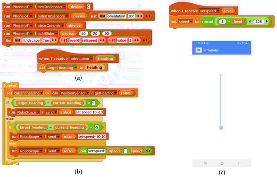 Figure 11. An example project that acts as a custom robot remote controller using PhoneIoT. (a) PhoneIoT code to set up the speed slider and start receiving target headings from the phone’s orientation/compass sensor; (b) RoboScape code to match a target heading and advance forward when facing the correct way; (c) the PhoneIoT app with its configured interface for throttle control.