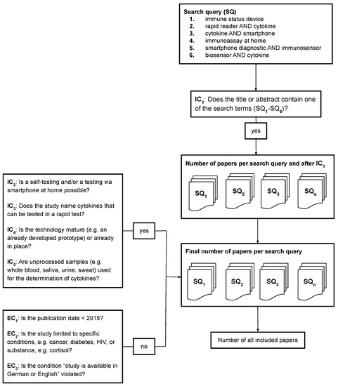 First, the search queries are applied to a total of five databases using the specific search syntax for each database. Inclusion criteria one (IC1) has to be already applied in this step, as the syntax for the search in the title and abstract must be adapted accordingly. The identified reports are then assessed for eligibility according to the inclusion and exclusion criteria (IC2–IC5, EC1–EC3) presented in Figure 1. Inclusion criteria two (IC2) is based on the characteristics for home tests found by Jamaludeen et al. in their review [10]. However, the characteristics are not applied quite as strictly. For instance, measuring multiple cytokines is desirable, but as it is not clear before the PRISMA literature review how many results for home testing even exist, results measuring only one cytokine are also included. The characteristics of small-volume samples in the microlitre range and a rapid assay time will be applied. In case no assay time is specified in the reports, it is also sufficient if the report mentions that the technology is rapid. Furthermore, smartphone-based readers are of most interest in the results, but again it is unclear before the PRISMA literature review how many results this includes. Therefore, reports from technologies that measure cytokines at home using other methods are also included in the results. The fifth characteristic will be applied but extended in inclusion criteria five (IC5) for other unprocessed samples such as saliva, sweat or urine. Inclusion criteria three (IC3) shows that the review focuses on cytokines. In addition, the technologies identified have to be mature in terms that these are either already in place or tested prototypes already exist (IC4). With exclusion criteria one (EC1), a year limit for scientific publications not older than 2015 will be applied due to technological developments in recent years (e.g., top-notch cameras in smartphones). Studies that report on technologies that are limited to specific conditions (e.g., diabetes) will be excluded because of exclusion criteria two (EC2) as the review intends to find technologies for a general application. Exclusion criteria three (EC3) limits the results for German and English languages.