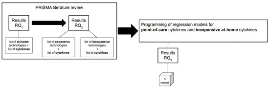 Pictorial overview of the approach to addressing the research questions. After performing the PRISMA literature review, the first research question RQ is answered by identifying the POC technologies with the corresponding cytokines that can be measured at home. Then, the at-home technologies with the corresponding cytokines are categorized as expensive and inexpensive cytokines/technologies as an answer to the second research RQ. Finally, we answer the third research question RQ by building machine learning models to predict the expensive cytokines using the inexpensive ones.