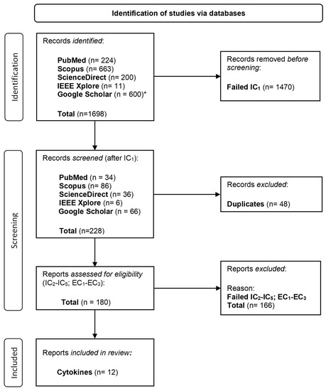 Figure 3 shows a flow diagram of the study selection process. A total of 1698 search hits could be identified with the search in the five databases. The majority of search hits had to be removed after applying IC1 (n = 1470). A total of 48 records were duplicates and therefore removed as well while screening the records. In the end, a total of 180 reports were assessed for eligibility. Most of them (n = 166) failed the eligibility criteria (IC2–IC5, EC1–EC3). One remark is that none of the retrieved studies reported their results in German. Two more reports were excluded because the tests were limited to animals. Finally, 12 reports remained on technologies that can be used to measure cytokines at home. Not listed among the included reports in the flow diagram are six reports that mention technologies that do not measure cytokines but do measure biomarkers related to the immune system. Therefore, these reports failed IC3.