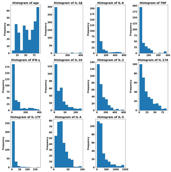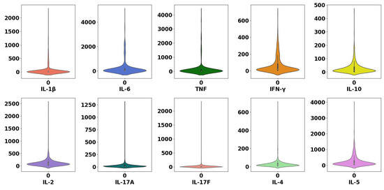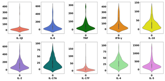 There are several reasons for possible outliers, e.g., mistakes during the data collection, recording or transcription [62]. With the help of violin plots, possible outliers can be detected. The dataset used has outliers that may affect the model building as illustrated in Figure 6. All the subjects in this dataset are healthy subjects. Therefore, we consider highly elevated cytokine values as outliers. For example, while most of the values of IL-6 are concentrated below 1000 pg/mL, some of them are higher than 4000 pg/mL. Thus, we consider all values that are higher than 4000 pg/mL for IL-6 as outliers. Similarly, for the cytokines IL-, IFN-, TNF, IL-10, IL-2, IL-17A, IL-17F, IL-4 and IL-5, we consider the values that are higher than 500, 500, 300, 200, 700, 100, 200, 100 and 1500 pg/mL, respectively, as outliers and hence we remove them. Figure 7 shows the value ranges for all the cytokines after the removal of the outliers.