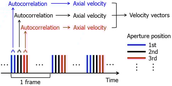 In this study, the multi-line acquisition was performed with the repeated transmit sequence [51]. Figure 2 shows the Tx sequence used in this study. As illustrated in Figure 2, the aliasing limit, i.e., the maximum measurable velocity, remains as large as possible by correlating complex beamformed signals obtained by consecutive emissions.