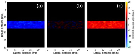 As described in Section 2.3, the tilt angle of the wavefront in the beamformed signal would be different from the Tx or Rx beam steering angle when the Tx and Rx steering angles are different. Therefore, the tilt angles of the wavefronts were first examined at different maximum Rx beam steering angles . Figure 4a–c show the estimated tilt angles of the wavefronts in the beamformed signal under Rx steering angles of , 0, and 20 degrees, respectively. The flow tilt angle was set at 0 degrees.