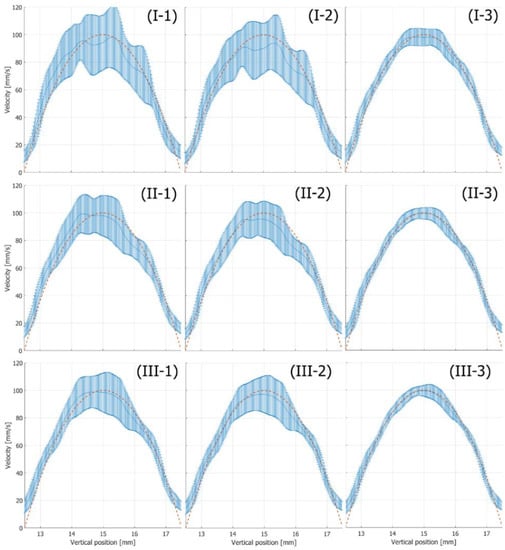 Means and standard deviations of estimated velocity magnitudes (flow tilt angle: 0 degrees, maximum velocity: 100 mm/s). The red dashed line shows the true velocity profile. The plots and vertical bars show means and standard deviations of estimated velocities, respectively. Results were obtained with Method 1 (I-1,II-1,III-1), Method 2 (I-2,II-2,III-2), and Method 3 (I-3,II-3,III-3). Rx beam steering angles were set at 10 (I-1–I-3), 15 (II-1–II-3), and 20 (III-1–III-3) degrees.