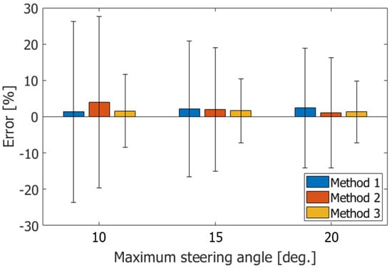 In Method 1, a constant value of 4.3 MHz was assigned as the center frequency over the entire region of interest by referring to ones estimated from the simulated data using Equation (3). Since the steered beams are used in the vector Doppler method, the fully beamformed region is narrowed due to the finite size of the linear array when the steering angle is increased. Therefore, the errors were evaluated within a lateral width of mm around the center of the field of view [48].