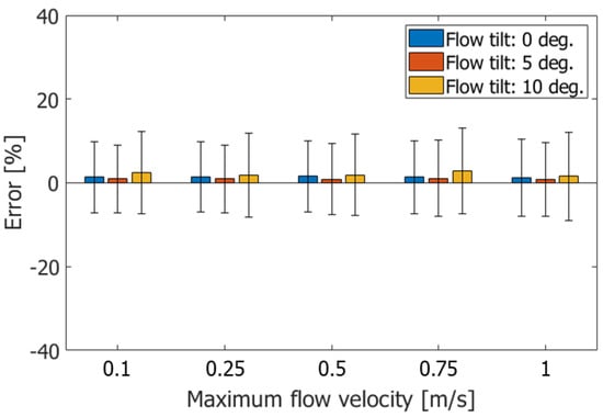 The performance of the proposed method was also evaluated under other conditions. In Figure 8, the ABEs and RMSEs are evaluated at different flow tilt angles (0, 5, and 10 degrees) and maximum velocities (100, 250, 500, 750, and 1000 mm/s) are shown by the boxes and vertical bars, respectively. The velocities were estimated with RMSEs of around 10% under different flow tilt angles and maximum flow velocities.
