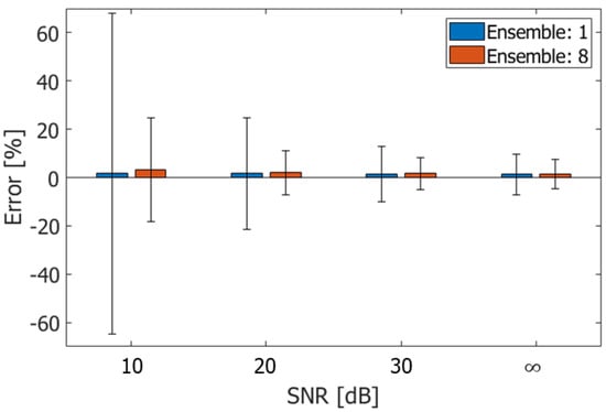 ABEs and RMSEs evaluated by estimating velocities without and with ensemble averaging. The errors are evaluated under different SNRs.