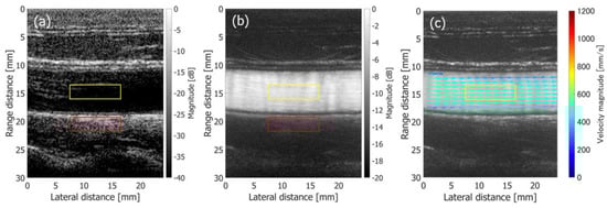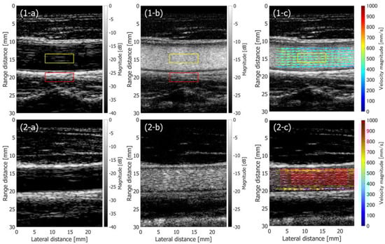 where and are the mean echo amplitudes in the regions of interest (ROIs) assigned in the vessel lumen and surrounding tissue, as respectively indicated by the yellow and red rectangles in Figure 10(1-a,1-b) and Figure 11a,b.
