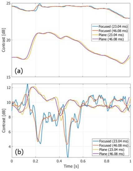 Figure 12a,b show the temporal changes in the contrast values obtained from non-filtered and clutter-filtered B-mode images, respectively. Different durations (23.04 ms and 46.08 ms) for averaging the complex correlation functions were examined. The contrast of the non-filtered B-mode image obtained with FB imaging was significantly higher than that obtained with PW imaging. The contrast of the clutter-filtered B-mode image with FB imaging was slightly higher in the slow-flow phase than that with PW imaging, while the contrast with FB imaging was significantly reduced in the fast-flow phase.