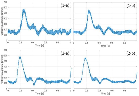 Temporal changes in means (plots) and standard deviations (vertical bars) of magnitudes of velocity vectors at vertical center of ROI. (1-a,1-b) FB imaging. (2-a,2-b) PW imaging [48]. (1-a,2-a) Ensemble length of 23.04 ms. (1-b,2-b) Ensemble length of 46.04 ms.