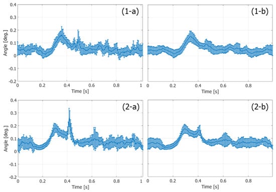 Temporal changes in means (plots) and standard deviations (vertical bars) of angles of velocity vectors at vertical center of ROI. (1-a,1-b) FB imaging. (2-a,2-b) PW imaging [48]. (1-a,2-a) Ensemble length of 23.04 ms. (1-b,2-b) Ensemble length of 46.04 ms.