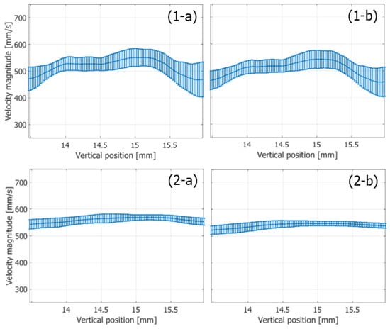 Means (plots) and standard deviations (vertical bars) of magnitudes of velocity vectors along the vertical axis at the time of the maximum mean velocity magnitude. (1-a,1-b) FB imaging. (2-a,2-b) PW imaging [48]. (1-a,2-a) Ensemble length of 23.04 ms. (1-b,2-b) Ensemble length of 46.04 ms.