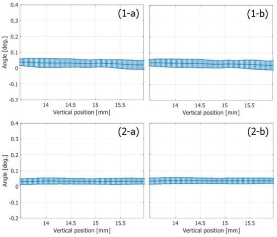 Means (plots) and standard deviations (vertical bars) of angles of velocity vectors along the vertical axis at the time of the maximum mean velocity magnitude. (1-a,1-b) FB imaging. (2-a,2-b) PW imaging [48]. (1-a,2-a) Ensemble length of 23.04 ms. (1-b,2-b) Ensemble length of 46.04 ms.