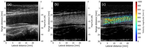 Results on in vivo measurement of a 48-year-old healthy subject obtained with PW imaging [48]. (a) Normal B-mode image. (b) Clutter-filtered B-mode image. (c) Flow velocity vectors estimated in cardiac systolic phase are overlaid on blood speckle image.