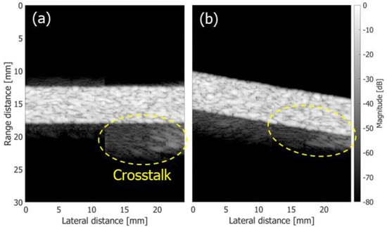 Although only two Tx beams were created in this study, the crosstalk between the two Tx beams affected the velocity estimation. In Figure 8, the errors in the estimated velocity vectors at flow tilt angle of 10 degrees are slightly larger than those at 0 and 5 degrees. To consider the reason for this phenomenon, B-mode images of the simulation phantoms at flow tilt angles of 0 and 10 degrees are shown in Figure 18a,b, respectively. The Rx beam steering angles were set at degrees in both cases. It should be noted that the B-mode images are displayed with a large dynamic range of 80 dB. In Figure 18a, the crosstalk artifact is found beneath the simulation phantom. In Figure 18b, such an artifact is considered overlapping with the simulation phantom due to the tilt of the phantom and affected the velocity estimation.