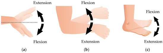 The example of left and right sides of upper and lower limb movement paradigms to investigate user proficiency with motor imagery for paradigms recommendation: (a) the left wrist flexion/extension; (b) right elbow flexion/extension; (c) right ankle flexion/extension.