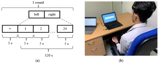 The participants performed the experiment using the task sequence illustrated in Figure 4a. The volunteers completed the experiments according to their upper and lower limb movement paradigms. They started by looking at the fixation “+” for 5 s to record the EEG signal in the resting state. Subsequently, each movement paradigm was imagined (Figure 2) for 5 s. The movements were randomly imagined 12 times on both the left and right sides, for a total of 24 times for 125 s per session. Each participant performed ten trials per experiment, twice per movement paradigm. The participants rested for 60 s before moving to the next paradigm. The time the participants spent was approximately 30 min in total. Each subject randomly performed left and right commands, with 20 trials per stimulus pattern and 80 trials per subject. After finishing the motor imagery tasks, each participant collected the EEG during the attention and eye closing stages for 5 s and five times per paradigm.