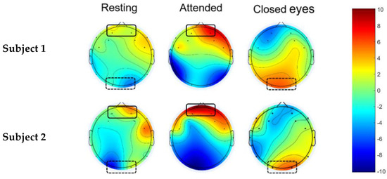 Attention to the green arrow: both sides of the frontal area (AF3 and AF4) exhibited a greater response in the alpha band (8–12 Hz) than in the resting state, according to topographic brain maps of subjects 1 and 2, as shown in Figure 6. For eye closing, the left and right occipital regions (O1 and O2) exhibited a greater response in the alpha band (8–12 Hz) than in the resting state, according to examples of the topographic brain maps of subjects 1 and 2, as shown in Figure 6.