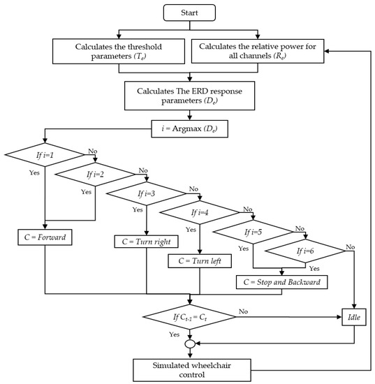 We also employed a double-check method for command creation by comparing the previous (Ct−1) and present commands (Ct) to avoid involuntary commands (true negative). When they are both the same commands, they are generated. The proposed algorithm establishes a command every 1 s, which requires 2 s for the command output.