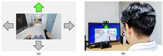 (a) Graphic user interface with simulated power wheelchair; (b) the example scenario of the simulated wheelchair control during the experiment.