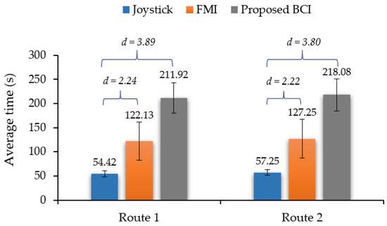 In Figure 9, using the proposed algorithm, the average time required for individual commands ranged from 173 to 278 s on route 1 and from 173 to 279 s on route 2. Compared with the FMI method, the performance of using the EEG artifacts from the EEG neuroheadsets via jaw chewing and eye winking to control the simulated wheelchair [33] was in the range similar to that from the previous studies. As the features of the EEG signal of the FMI methods are different, this proposed MI-based BCI system required a time of around 90 s on both routes 1 and 2, which is more than that using the FMI method. Moreover, the time difference between the proposed BCI and joystick-based control was approximately threefold.