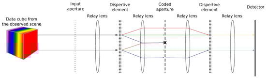 To perform hyperspectral imaging, Gehm et al. [9] proposed a different acquisition scheme based on a device called a Double Disperser Coded Aperture Snapshot Spectral Imager (DD CASSI) that has the particularity of exploiting Compressive Sensing (CS). In order to reconstruct the hyperspectral cube, several acquisitions with different codes are done. These acquisitions are then processed to recover the hyperspectral cube, and the missing data are extrapolated thanks to an a priori model. This system is composed of two dispersive elements (prisms) placed on both sides of a Digital Micromirror Device (DMD). (A Digital Micromirror Device is a microoptoelectromechanical system composed of a matrix of configurable mirrors. Each mirror can be either in a transmission state or a rejection state. In the transmission state, the incoming light is redirected to another part of the optical system, while in the rejection state, the incoming light is redirected to a light absorber or elsewhere.) This also includes a coded aperture and finally a detector (CCD) to capture the two-dimensional multiplexed signals of the three-dimensional data of the scene. The second prism (see Figure 1) balances out the shearing (dispersion and shifting of the light rays) caused by the first prism. This results in measurements that spatially match those of the scene. The data cube projected onto the detector is not sheared; this means that the spectral components of a spatial point in the data cube end up in the same position on the sensor. A pixel of the sensor acquires a mix of the spectral information. A DMD configuration of the coded aperture defines a multiplexing combination. Then, a set of predefined codes enable capturing a subset of mixed spectral information.