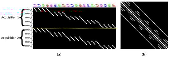 Because the MR model takes into account the relation between a set of rows to differentiate the acquisitions, the different rows and the distinct wavelengths, the previous pattern for the OR model is replicated and shifted along the horizontal and vertical axes, as shown in Figure 3a. Then, in Figure 3b, we can see that contains a repetition of OR’s pattern with additional diagonals. Generally speaking, diagonals are located at positions 0, , , and R distinct square submatrices of size are placed along the main diagonal. These submatrices contain diagonals placed at positions with . We can also notice that in the diagonals at positions , every -th entry with is a 0.
