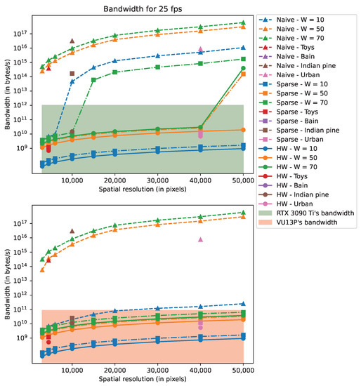 Regarding memory footprint, let us consider every value is stored in 64 bits; from (9), we deduce that it reaches 173 MB per row of the OR model, 5.2 GB in total for the OR model and 156 GB for the MR model. Since the memory footprint exceeds the work memory for both devices, memory swapping is needed (see Section 4.3.3). Therefore, the memory transfer for a reconstruction would be several TBs for the OR model and hundreds of TBs for the MR model. Because of this, reconstruction with the OR model would take around 15 s for the RTX 3090 Ti and 125 s the VU13P. These reconstruction times are not suitable for real-time applications, and we have to find ways to reduce them.