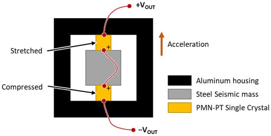 Operating principle of a compressive-type piezoelectric accelerometer with a pair of PMN-PT single crystals (other axes are omitted for clarity). The plus symbol on a single crystal indicates positive voltage output under compression.